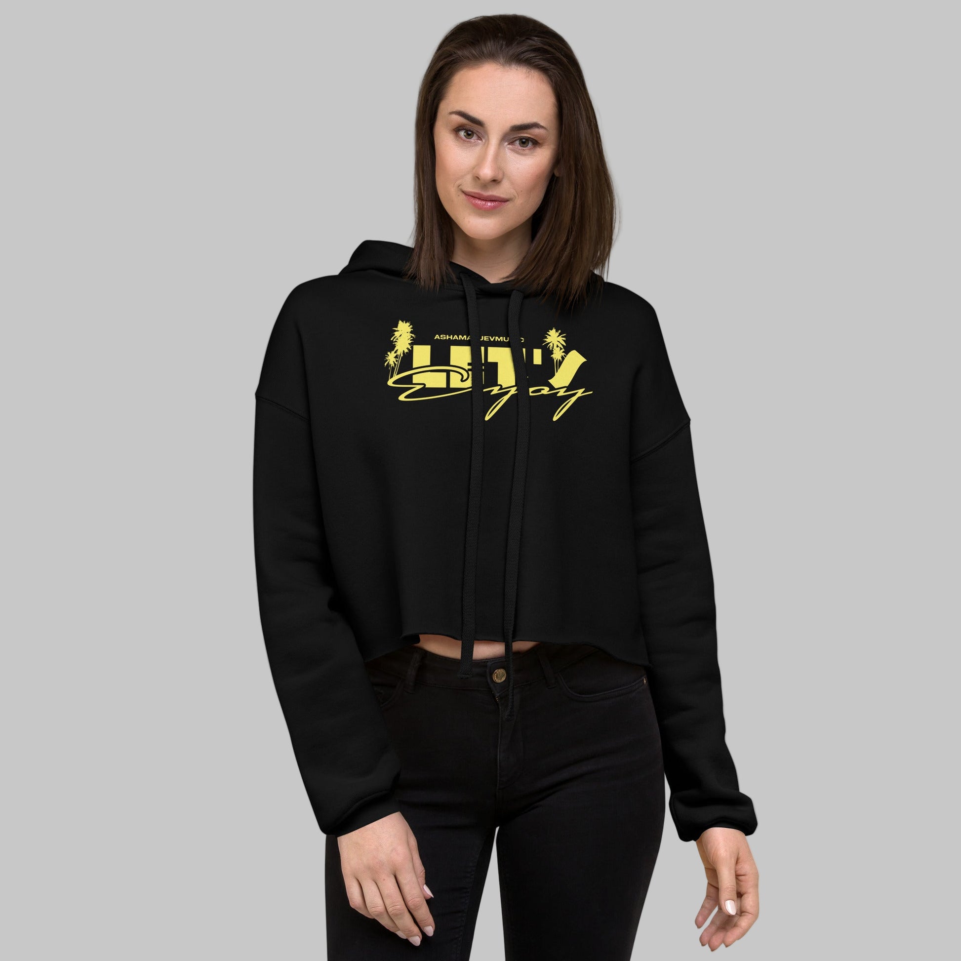 Women's crop hoodie "Let's Enjoy" by AShamaluevMusic. Let fashion take over your wardrobe with this great statement piece. The trendy raw hem and matching drawstrings means that this hoodie is bound to become a true favorite.