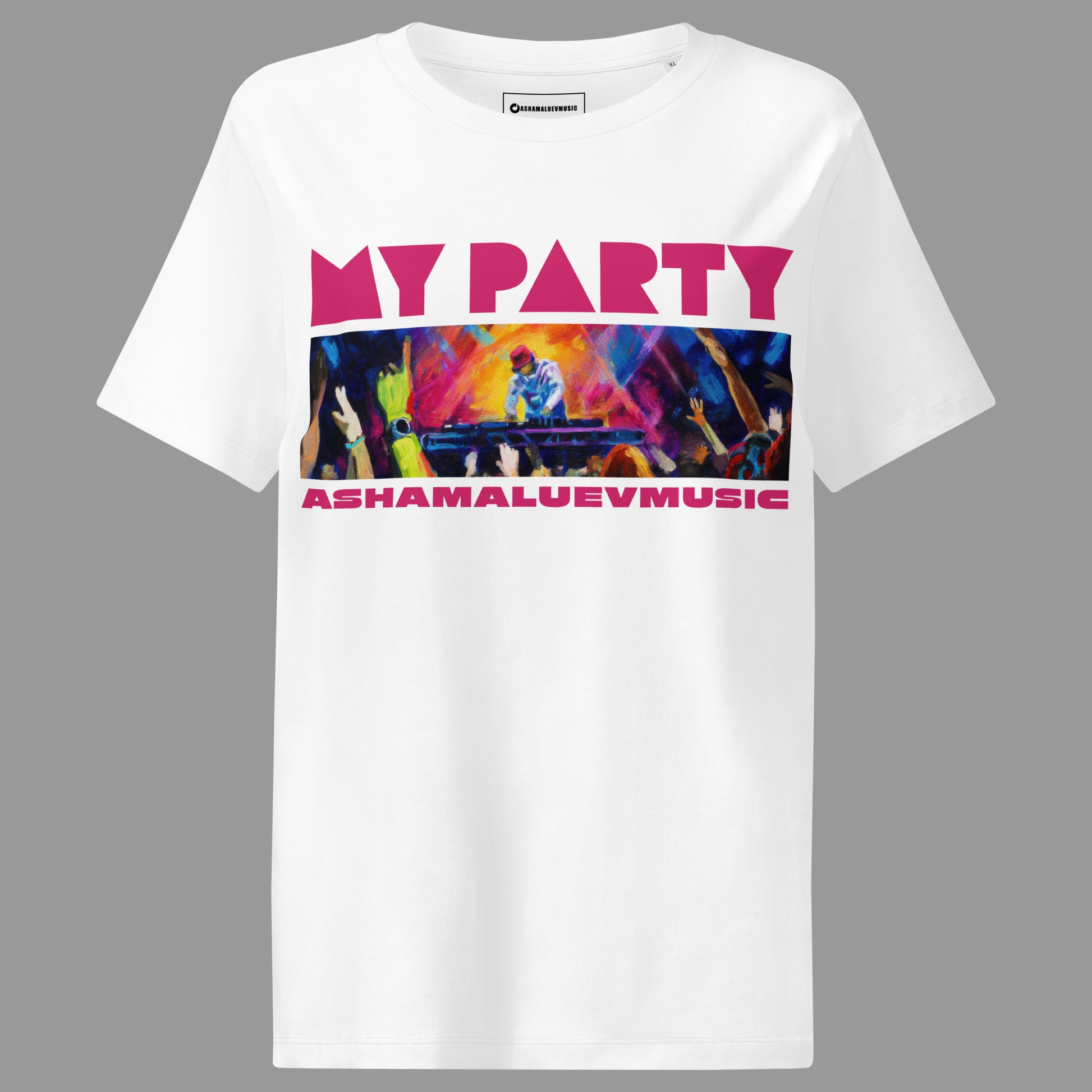 Women’s short-sleeve t-shirt 'My Party' by AShamaluevMusic. This women’s tee is designed to flatter your body shape. Made from 100% organic cotton, it offers a premium feel. The ribbed neck adds a polished finish.